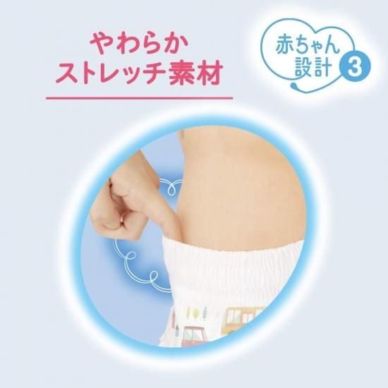 ●フィットしてすきまモレ安心。「すっぽりハイウエスト」と「ぴたっとギャザー」採用で、元気に動きまわる赤ちゃんにも、フィットしてすきまモレ安心です。