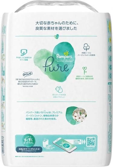 ●パンパース肌いちPureは、プレミアムバージンコットン、植物由来柔らか繊維等、厳選された素材を使用。