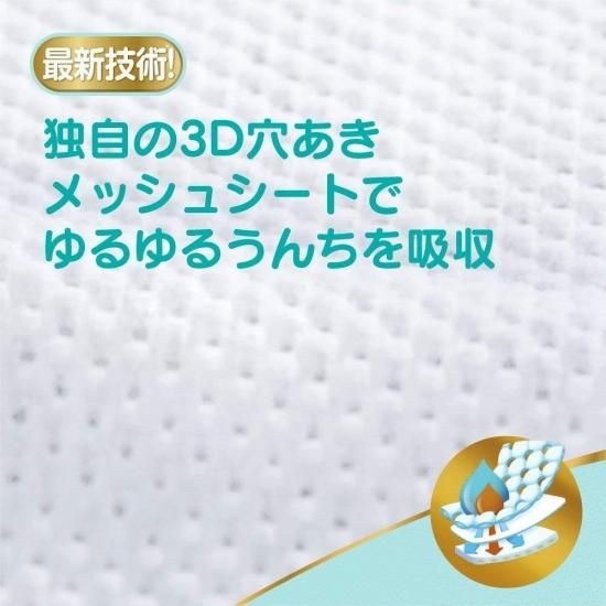 ●新改良。独自の穴あきメッシュシート。パンパースの独自のシートが、肌への刺激となる水分を吸収し、赤ちゃんの肌に近づけません。
