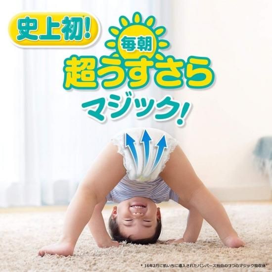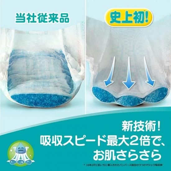●新技術。 吸収スピード最大2倍で、お肌さらさら。パンパース独自の「3つのマジック吸収体」で、分散して即吸収。おしっこを肌によせつけず、最長12時間お肌さらさら。