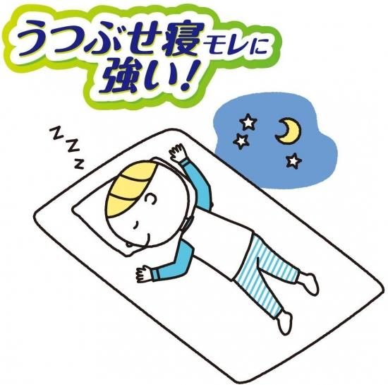 ●うつぶせ寝に強く、一晩中安心の吸収パワー。うつぶせ寝で排尿しても、尿をしっかり吸収します。おしっこが多い日でも一晩中安心の吸収力です。