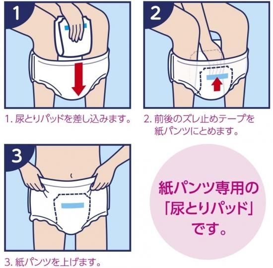 ●紙パンツにあう二つ折り形状とズレどめテープでご本人でも簡単に交換できる、紙パンツ専用の尿とりパッドです。