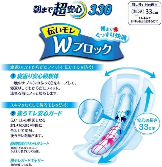 ●「寝返り安心吸収体」が一晩中ナプキンのふっくらをキープして、寝返りしてもからだにフィット。流れる前にスッと吸収し、伝いモレを防ぐ。