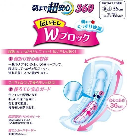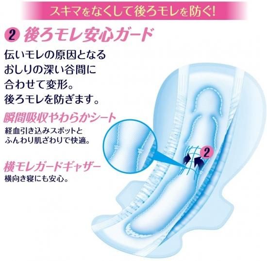 ●「寝返り安心吸収体」が一晩中ナプキンのふっくらをキープして、寝返りしてもからだにフィット。流れる前にスッと吸収し、伝いモレを防ぐ。