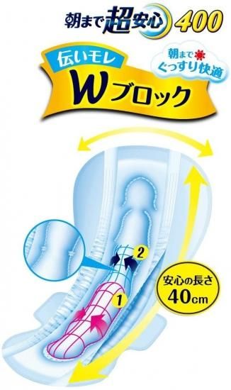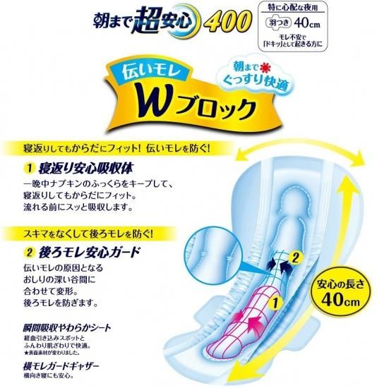 ●「寝返り安心吸収体」が一晩中ナプキンのふっくらをキープして、寝返りしてもからだにフィット。流れる前にスッと吸収し、伝いモレを防ぐ。